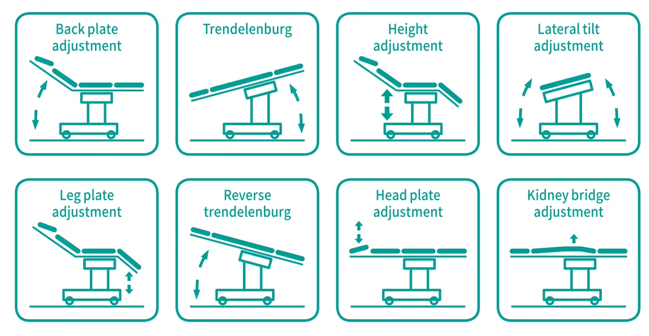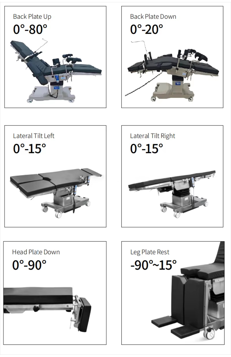 Pengangkatan meja, kemiringan ke belakang dan ke depan, kemiringan kiri dan kanan, pelipatan pelat belakang ke atas dan ke bawah, dan translasi semuanya dikendalikan oleh batang dorong listrik.